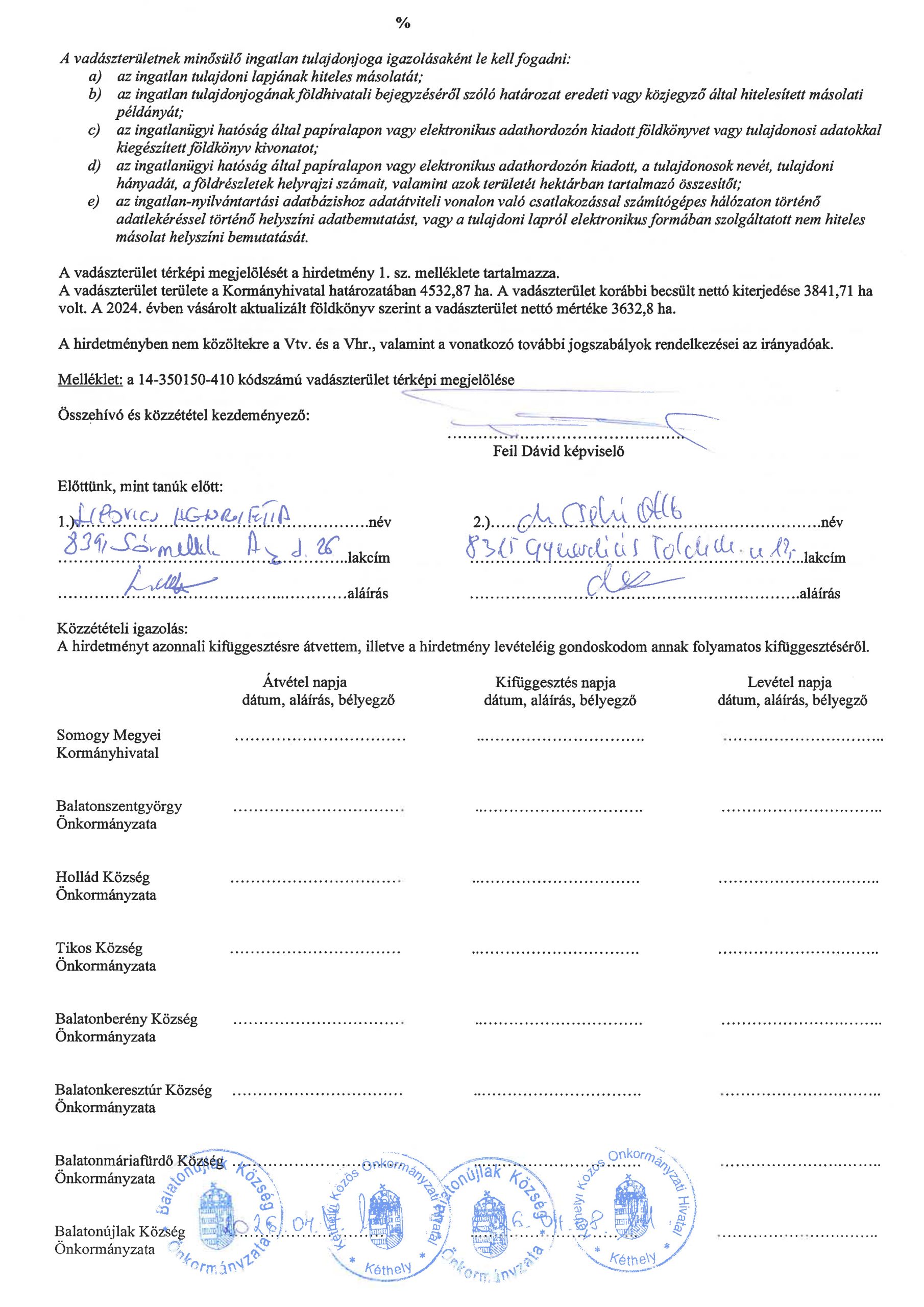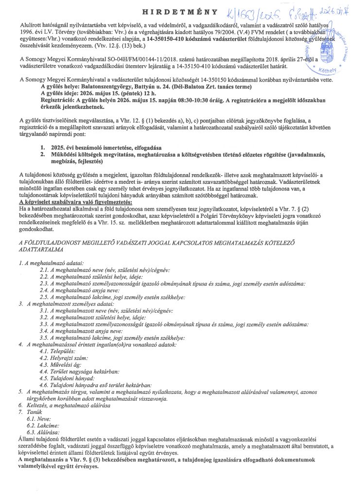 14-350150-410 kódsz. vadászterület földtulajdonosi közösség gyűlésének összehívásai hirdetménye