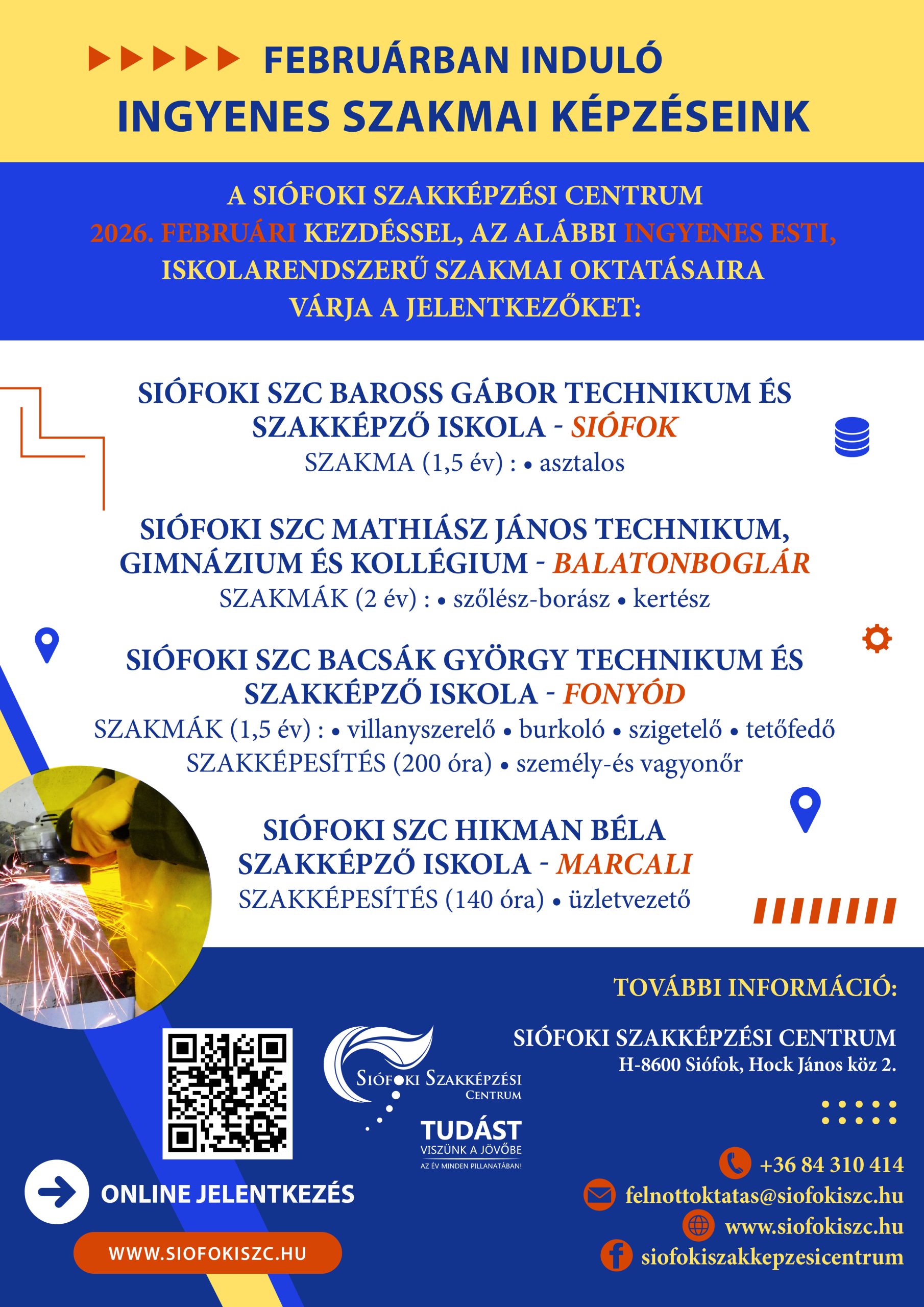 A Siófoki Szakképzési Centrum ingyenes, felnőtteknek szóló szakmai képzéseit ajánljuk figyelmükbe. A képzések indítását 2026 februárjában tervezzük. Négy iskolánkba – Siófokra, Fonyódra, Balatonboglárra és Marcaliba várjuk a jelentkezőket.