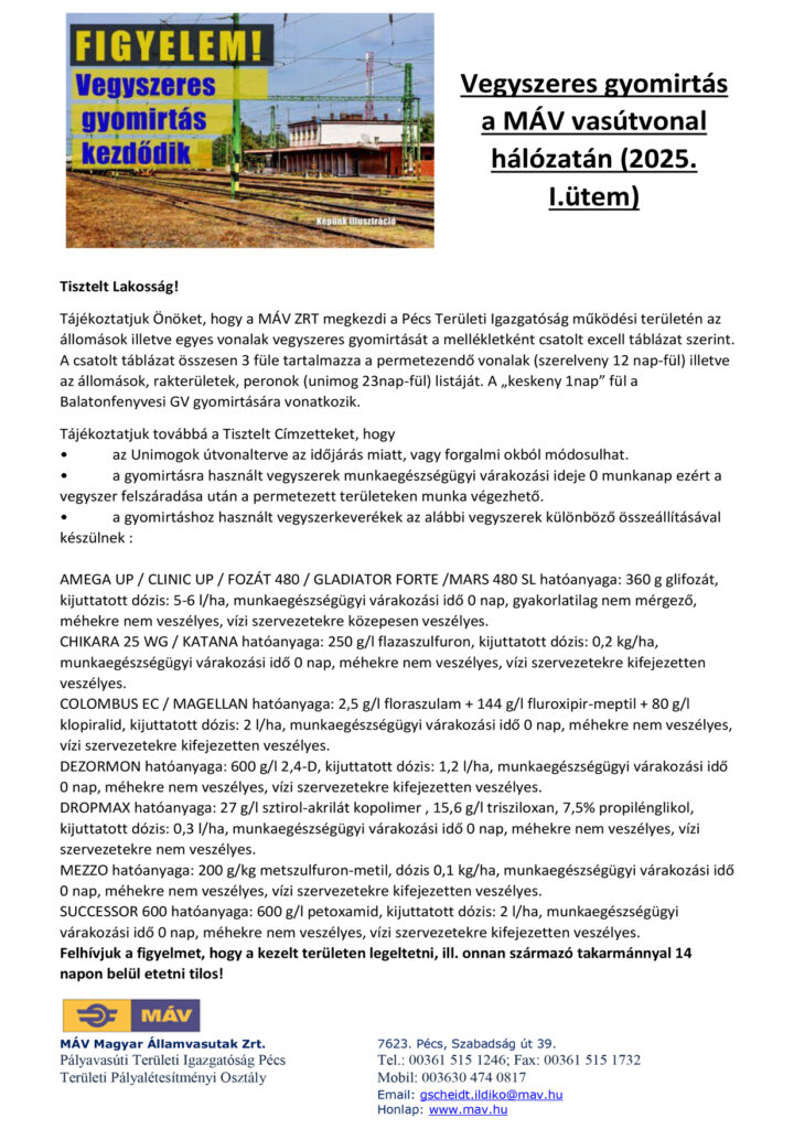 Vegyszeres gyomirtás a MÁV vasútvonal hálózatán (2025. I. ütem)